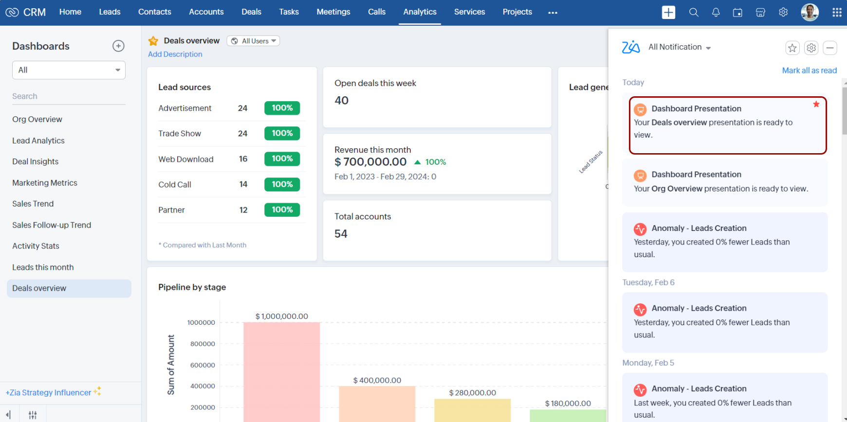 On the communication side, Zia reviews emails and calls to understand what customers are really saying. It’s not just the words, but the tone behind them. The CRM analyses both intent and sentiment, so that teams can prioritise messages properly and respond in a way that fits the situation. This makes conversations more thoughtful, reducing instances of rushed or generic replies.